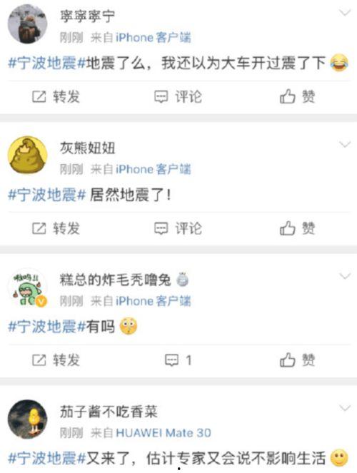 地震发生后,网友们纷纷热议,猜测地震的原因。有人说:“是不是附近有大型工程在施工,导致地震?”也有人猜测:“是不是地球板块运动引起的?”还有网友调侃:“宁波地震,是不是因为宁波人太热情,地球都晃动了?”